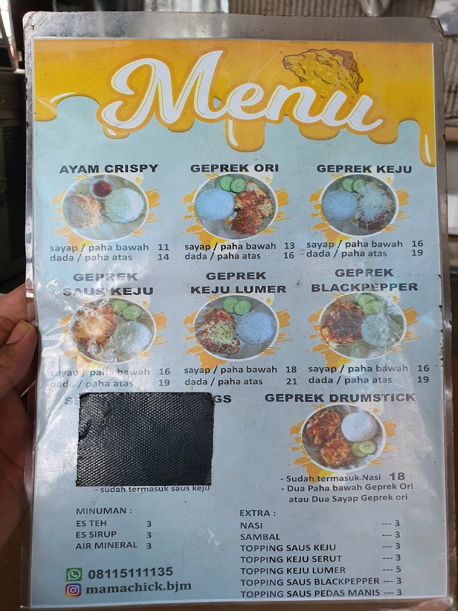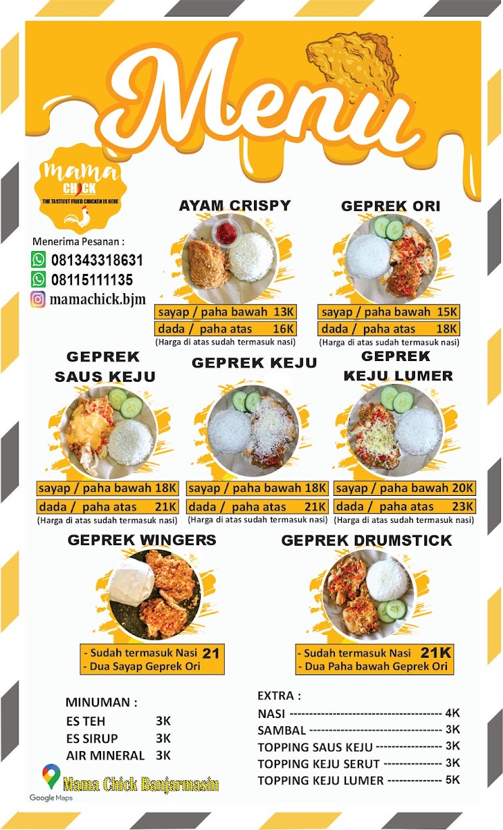 Mama Chick Banjarmasin stands out as a beloved local gem in the heart of Banjarmasin Utara, known for its flavorful and affordable ayam geprek. Located conveniently across from Alfamart on Jl. Mesjid Jami, this restaurant offers a modest space with both lesehan and seating options, perfect for small groups or takeout. The highlight is undoubtedly their crispy, tender chicken paired with a variety of sambal sauces—each bursting with bold, spicy flavors that keep customers coming back for more.